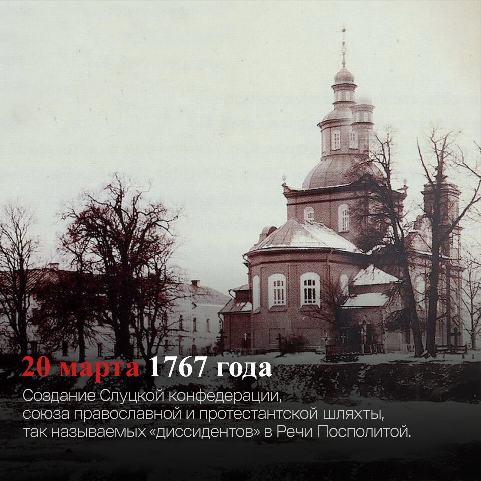 20 марта 1767 года – создание Слуцкой конфедерации – союза православной и протестантской шляхты, так называемых «диссидентов» (некатоликов) в Речи Посполитой. Ущемление в правах «диссидентов» в Речи Посполитой вынудило российское правительство выдвинуть требование о необходимости уравнения прав некатоликов с католиками. Требование было отвергнуто польским правительством и в 1767 г. в Речь Посполитую были введены российские войска. В связи с этими событиями и создана Слуцкая конфедерация, учреждённая в Слуцком монастыре Св. Троицы. Её вдохновителем являлся епископ белорусский Георгий Конисский, сыгравший исключительную роль в отстаивании православия в Речи Посполитой. В результате этих действий в 1768 г. польское правительство вынуждено было гарантировать равноправие всех христианских конфессий на своей территории.