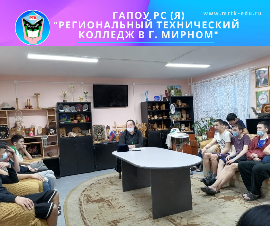 Профилактическая беседа инспектора ПДН со студентами, проживающими в общежитии МРТК. 19 марта 2022 г. в общежитии ГАПОУ РС (Я) «Региональный технический колледж в г. Мирном» с целью профилактики правонарушений и преступлений в молодежной среде, была организована встреча студентов со старшим инспектором ОУУП и ПДН ОМВД майором полиции Алтаной Базаровой. В своей беседе Алтана Олеговна коснулась ответственности за совершение таких преступлений, как кража, грабеж, вымогательство, причинение телесных повреждений. Подросткам было разъяснено, с каких лет наступает уголовная ответственность и какие наказания применяются за совершение преступлений. Рекомендовала соблюдать правила поведения на улице, в общественных местах, местах массового отдыха, не забывать о соблюдении комендантского часа. Напомнила студентам о вреде употребления спиртных напитков и табака, а также объяснила, чем опасны эти пагубные привычки. Ребята с большим вниманием слушали инспектора и получили ответы на все интересующие