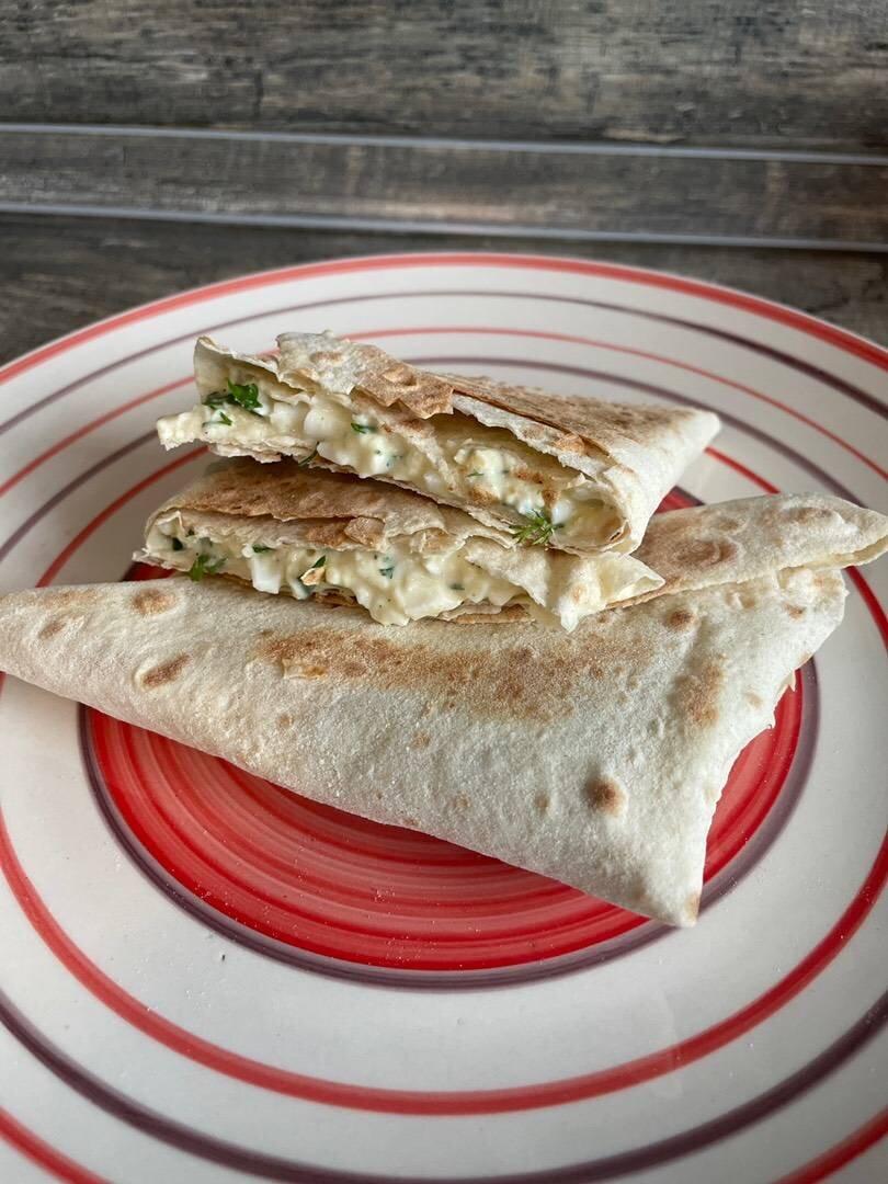 Режем лаваш на толстые полоски, добавляем начинку и сворачиваем треугольниками.
