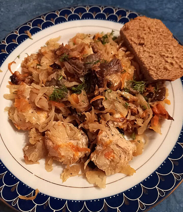 Всё порезала, перемешала и в мешок для запекания. Запекала 90 минут при 180 градусах. К капусте - кусок ржаного хлеба на экстракте стевии.