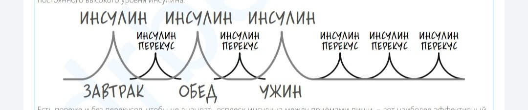 (и не будем забывать о перекусах) вызовет всплеск инсулина. Частые приёмы пищи в течение дня – причина постоянного высокого уровня инсулина. Есть пореже и без перекусов, чтобы не вызывать всплеск инсулина между приёмами пищи, – вот наиболее эффективный