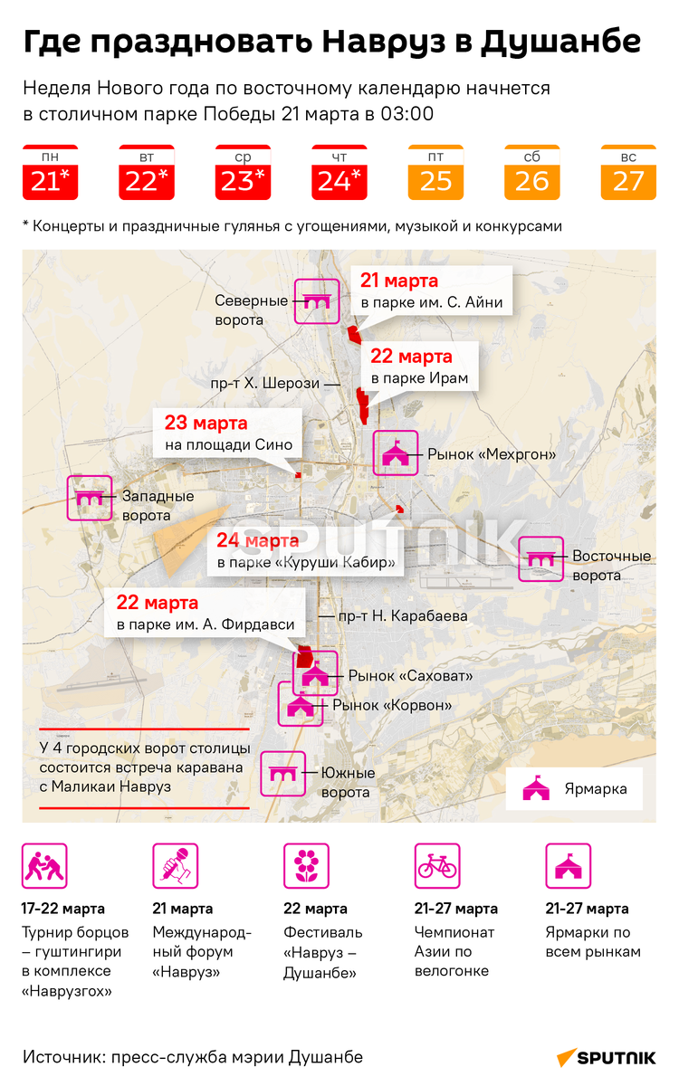 Мэрия Душанбе обнародовала программу празднования Международного дня Навруз в таджикской столице Парки, рынки и скверы в третьей декаде марта превратятся в площадку, где для жителей и гостей Душанбе пройдут выставки, концерты и спортивные соревнования.