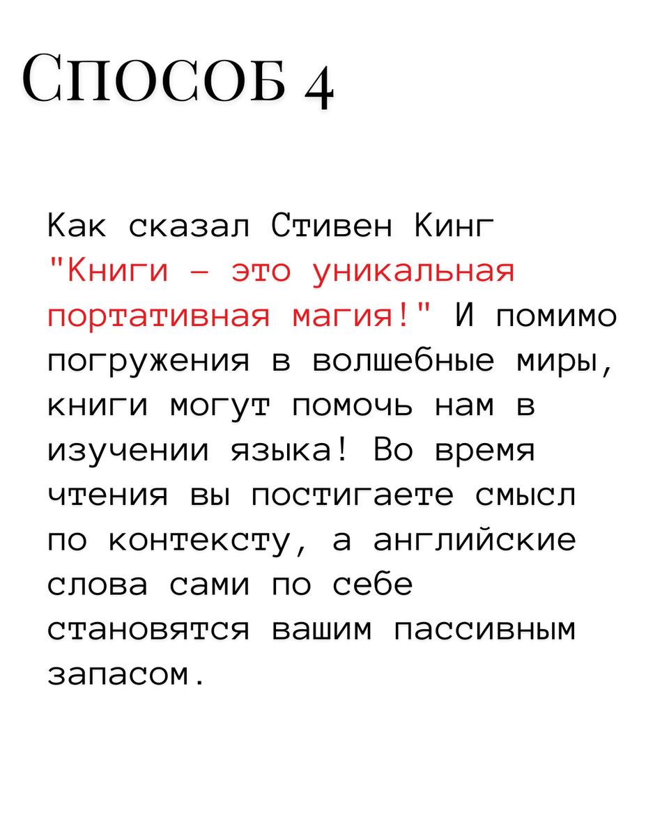Хотите еще несколько действенных способов запоминать английские слова? 🤓 Читайте, сохраняйте и отправляйте друзьям! 1️⃣ Решайте кроссворды! Конечно, популярность этой игры значительно снизилась с появлением интернета, но благодаря последнему, вы можете найти множество сайтов с возможностью решать кроссворды на английском языке. Для начала используйте учебные кроссворды, с разбивкой по уровням, а по мере увеличения словарного запаса — переходите к более сложным вариантам. 2️⃣Играйте в компьютерные игры! Это удивительно, но процесс обучения можно сделать не только полезным, но и приятным. Возьмите вашу любимую игру и играйте в неё на английском языке. Возможно, вначале вы не будете понимать все, что происходит, но в процессе игры вы интуитивно начнете вникать в происходящее, а в последствии — запоминать новые слова. 3️⃣Используйте новые слова в речи! Вы студент школы "Бенедикт"? Тогда у вас точно есть напарник, с которым вы вместе грызете гранит науки. Так почему бы не устроить себе раз