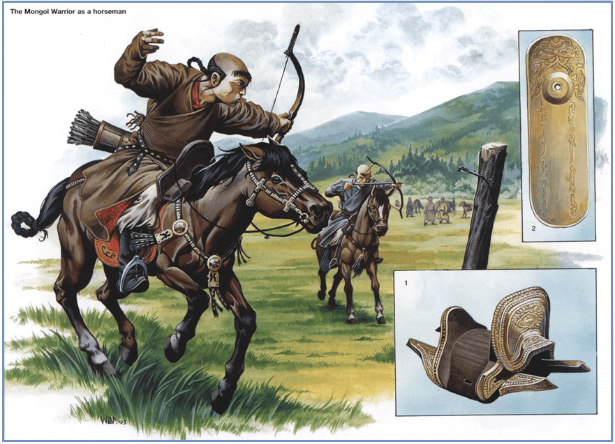 Основой военного могущества монголов была легкая кавалерия - мобильная, обученная действовать согласно общему плану, вооруженная cмeртoнocными дальнобойными луками. Уже после первого столкновения на реке Калке, воины русских дружин сочли, что эти кочевники "стреляют пуще, чем половцы". В дальнейшем над ними не могли одержать победу целое столетие после завоевания.