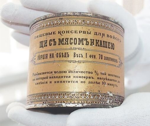 В Российской империи первый консервный завод был открыт только в 1870 году, в Санкт-Петербурге. Владелец завода Франсуа Азибер, французский предприниматель, осуществлял консервирование по методу Николя Аппера. Но консервы в России прижились далеко не сразу. Широкому распространению консервов поспособствовала только Первая мировая война. Поначалу консервы (как и на Западе) использовались только на флоте, а затем начали в армии. Главным преимуществом таких консервов был длительный срок хранения при высокой калорийности содержимого. Стоит отметить, что для производства таких консервов использовались самые лучшие и отнюдь не дешёвые ингредиенты. В 1904-1905 гг. на частных консервных заводах Петербурга, Одессы, Риги и Митавы (ныне Елгава), работающих на военное ведомство, выпускалось до 250 000 консервных банок в день. В год – почти 70 миллионов банок. В годы Великой войны 1914-1918 гг. армия стала закупать консервы огромными партиями. Тогда военнослужащим предписывалось греть продукты прям