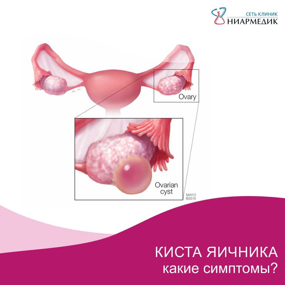 Не узнаете, пока не сделаете УЗИ. Или... Или насторожить Вас могут симптомы. Итак сегодня о них! Тянущие боли внизу живота, боль во время или после полового акта, нарушение менструального цикла – так может проявлять себя киста яичника. Киста яичника: что должно насторожить? Расскажем, что это такое, и почему так важны плановые осмотры у гинеколога. Киста яичника, или опухоль яичника, – болезнь очень КОВАРНАЯ. Она почти не проявляет себя, и многие пациентки относятся к ней как к чему-то не опасному. Увы, порой даже маленькое образование может нанести здоровью непоправимый вред – вплоть до бесплодия. Тревожные симптомы: • тянущие или ноющие боли (или чувство распирания внизу живота), усиливающиеся во время полового акта, физических нагрузок, мочеиспускания или месячных • нарушения менструального цикла (месячные отсутствуют или их период удлиняется) • бесплодие • увеличение живота (если киста крупная) • кровянистые выделения из влагалища • учащение мочеиспусканий, запоры (
