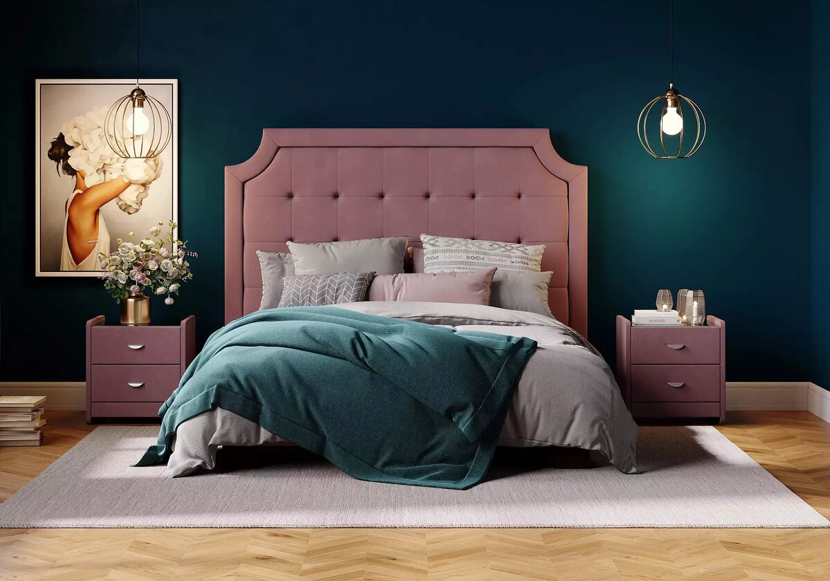 Основной акцент в кровати сделан на высокое, фундаментальное изголовье (151 см), украшенное декоративными швами и каретной стяжкой с пуговицами.