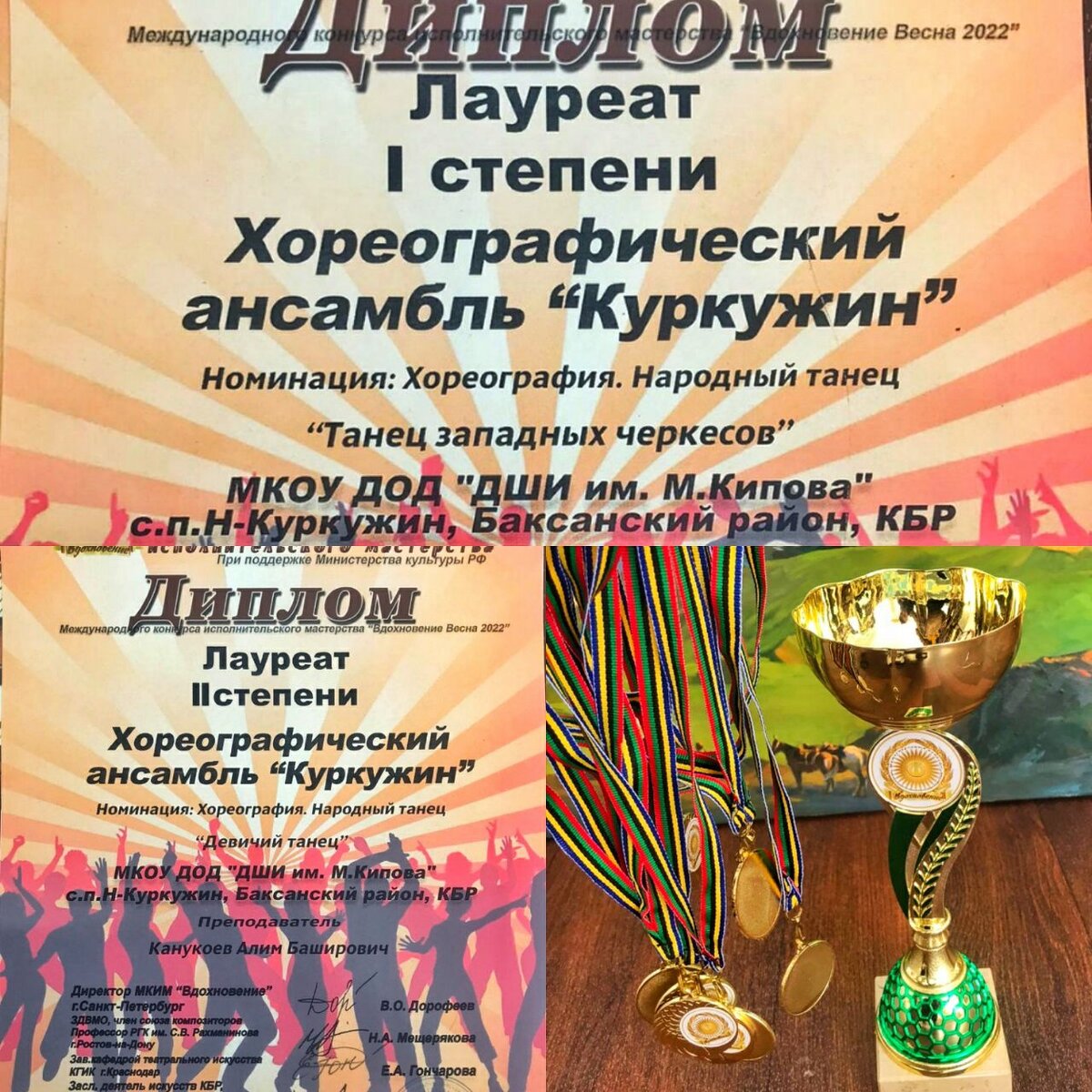 20 марта в государственном музыкальном театре г. Нальчик проходил всероссийский конкурс исполнительского мастерства «Вдохновение». Хореографический ансамбль «Куркужин» детской школы искусств им. М. Кипова занял первое место в номинации «Хореография. Народный танец» исполнив «Танец западных черкесов» и второе место в той же номинации исполнив «Девичий танец». Преподавателем призеров престижного конкурса является заслуженный артист КБР Алим Канукоев. Основной целью конкурса является сохранение и развитие культурного наследия России и мира в секторе детского и молодежного творчества; объединение детей России и зарубежных стран на основе мирного сосуществования народов мира, толерантности и взаимопонимания в единый творческий союз. Поздравляем ребят и желаем дальнейших успехов.