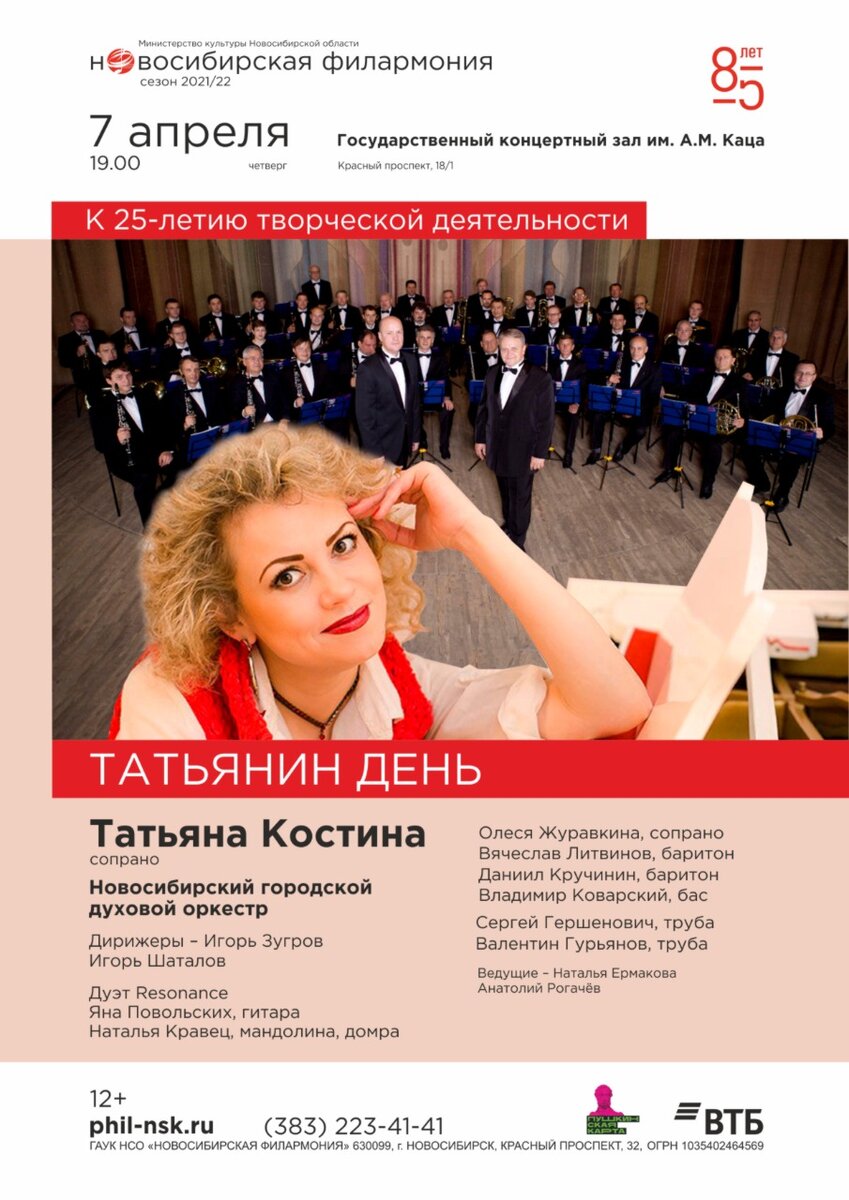 Новосибирская государственная филармония, коллеги и друзья одной из самых ярких сопрано города - ТАТЬЯНЫ КОСТИНОЙ приглашают вас на концертную программу, посвящённую 25-летию творческой деятельности певицы - "ТАТЬЯНИН ДЕНЬ" ! Каждый концерт солистки Новосибирской филармонии Татьяны Костиной, обладающей богатым, сочным, проникновенным сопрано, становится настоящим праздником для слушателей, а уникальный диапазон певицы позволяет ей дарить почитателям ее таланта наисложнейшие вокальные произведения. Многие помнят артистку по ярким выступлениям с Новосибирским академическим симфоническим оркестром, в том числе в постановке трилогии Карла Орфа «Кармина Бурана», «Катулли Кармина» и «Триумф Афродиты».