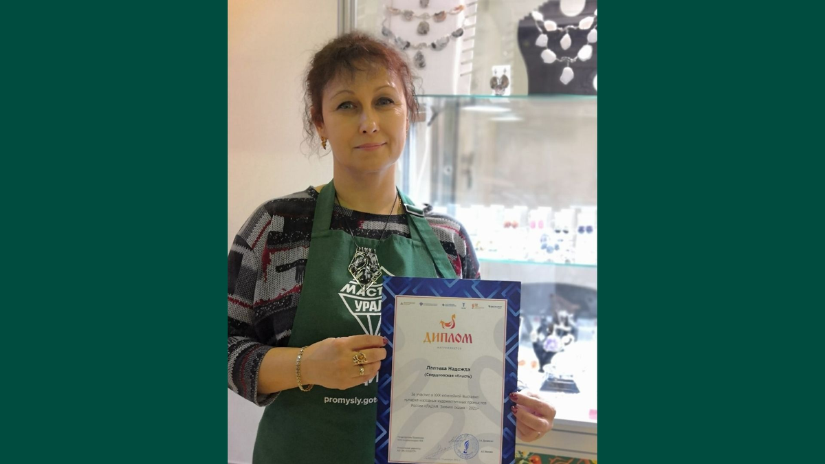Мастер народных художественных промыслов, ювелир Более 15 лет Надежда Вячеславовна Лаптева занимаемся изготовлением ювелирных изделий из самоцветов. В её мастерской налажен законченный цикл производства, начиная с обточки кабошонов до готового изделия. Надежда Лаптева обучалась ювелирному делу самостоятельно. Муж мастерицы занимался изготовлением кабошонов на домашнем станке в свободное время от основной работы, которая была связана с геологоразведкой. Надежда Вячеславовна заинтересовалась сначала минералами, а затем изготовлением ювелирных изделий из них. Изучала материаловедение, проходила мастер-классы других мастеров в Екатеринбурге. Освоила обточку кабошонов и работу с металлами, а также ювелирный дизайн. Изделия в мастерской Лаптевых производятся только из натуральных камней: яшмы, змеевика, малахита, агата, кахолонга, лазурита, родонита и других. Камень оправляется в мельхиор по традиционным технологиям мастеров Урала. Основной ассортимент: кольца, подвески, колье, браслеты и др