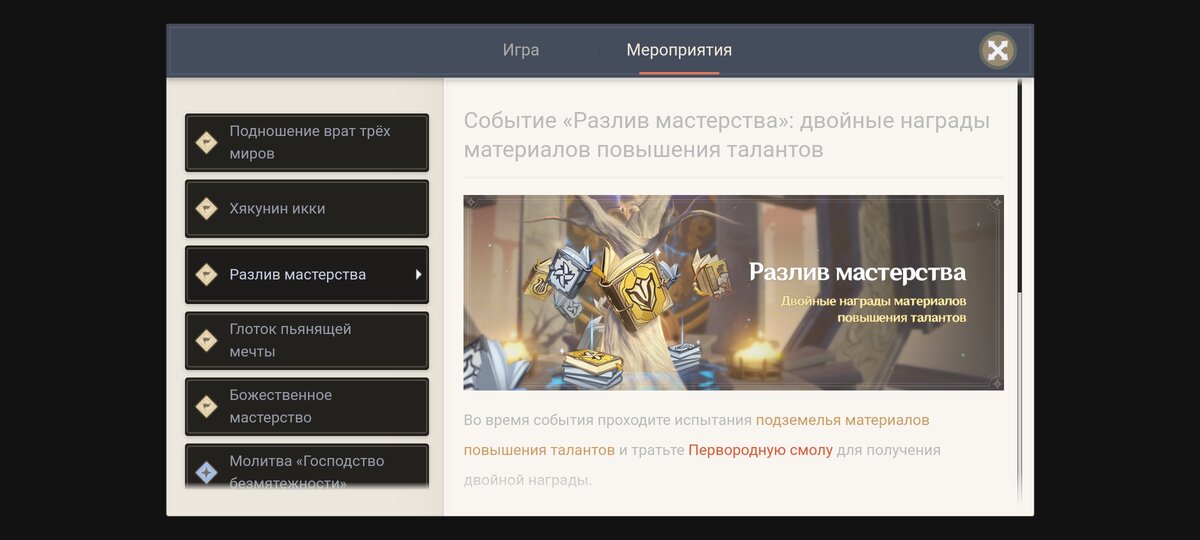 Доброго времени суток. Сегодня я расскажу вам о событии, которое уже стало нормой в конце почти каждой версии Геншина. На этот раз разработчики решили устроить нам удвоение книг талантов. Как сказано в посте, мы будем получать удвоенную награду из подземелий телентов всего за 20 единиц первородной смолы. Однако, в день у нас будет только 3 попытки. Длиться событие будет в течение недели с 21 по 28 марта, поэтому не забудьте воспользоваться данной возможностью сэкономить смолу.