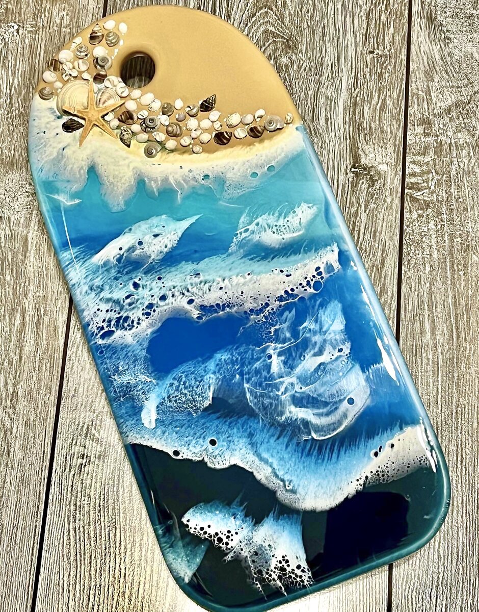 Давно мечтала поработать с эпоксидкой. Думала, выйду в декрет, пройду мастер-класс. Не вышло! Оказывается, загуститель для смолы достаточно токсичен. Беременным, кормящим и детям противопоказано. И вот настал долгожданный момент. Расскажу о своем первом опыте, чтобы каждый новичок понял, что желание и фантазия правят творческим миром. “Хочу море, волны, желтый песок и пену”. С этими мыслями я шла на занятие. Выдали мне деревянную заготовку, респиратор, и процесс начался: – Мама, это ты сделала? Ты не могла сама такое нарисовать, – сказала дочь. Двоякое ощущение: впервые мой ребенок усомнился в моих способностях, но раз это произошло, значит, результат действительно потрясающий! А о каком интересном опыте можете рассказать вы? Поделитесь в комментариях.