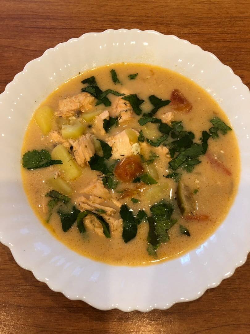 #меню #уха Вкус волшебный, ароматный и просто неповторимый! 😋 Ингредиенты: Форель или сёмга, Картофель, Помидоры, Томатная паста , Вода, Лайм, Чеснок, Плавленый сыр для соусов и супов , Лавровый лист , Чёрный перец горошком, Соль , Основа для супа Том Ям (если нет, то и без неё получается великолепно), Кинза и/ или петрушка для подачи Способ приготовления: Рыбу почистить, залить холодной водой, посолить, поставить варить. После закипания снять пену. Добавить лавровый лист, чёрный перец горошком. Варить 10 минут. Достать рыбу, отделить от костей, нарезать на небольшие кусочки, положить обратно в бульон. Добавить картофель, нарезанный кубиками. Нарезать помидор, лайм, выдавить чеснок через пресс. Добавить в суп. Выложить в кастрюлю томатную пасту, сыр и заправку для супа Том Ям (заправку не обязательно, но желательно!). Варить на небольшом огне до готовности картофеля и полного растворения сыра. Подавать с мелко нарезанной зеленью. Приятного аппетита!