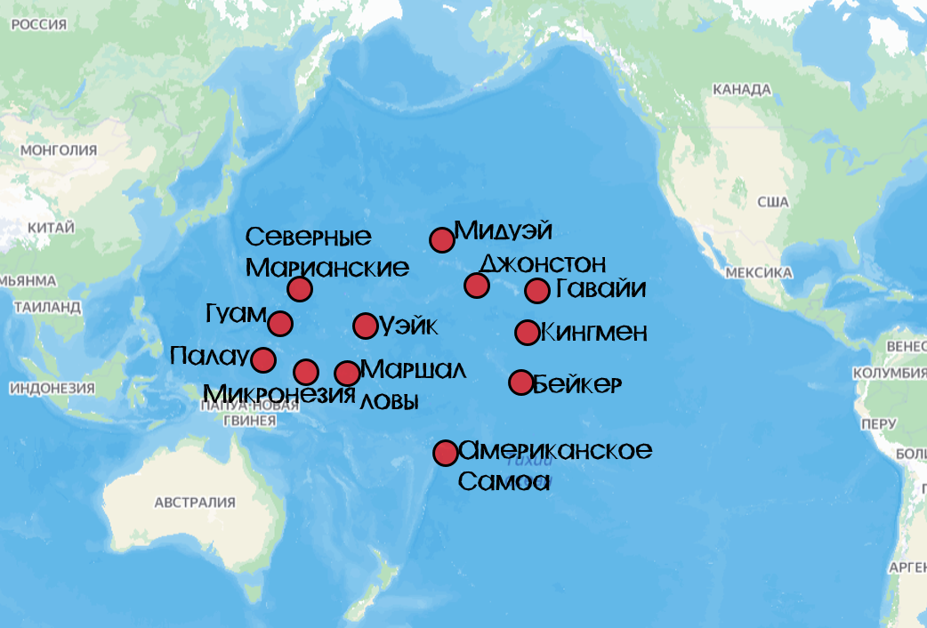 Прогадал американский президент с русским народом. Это для них там трагедия если исчезнет Макдональдс с Кока-Колой. А у нас на этом фланге полное импортозамещение: от пельменей и чебуреков до шаурмы (шавермы). Да и русский квас фору даст любой пепси-коле. В общем не вышел злобный русский на улицу Путина свергать и требовать остановки спецоперации. Так что Байдену не остается другого выхода, как продолжать придумывать новые санкции против России. В этот раз поговаривают, что Америка решила перекрыть морские пути России. Давайте попробуем с вами рассмотреть масштабы этого решения. Морская блокада США. Чтобы оценить влияние США в мировом океане для начала определим колонии под контролем Америки. В Тихом океане американцы не слабо наследили. На карте ниже отмечены острова, которые кроме Гавайев, Микронезии, Палау и Маршалловых островов имеют статус неинкорпорированных территорий США. Это значит, что они находятся под управлением США, но при этом не являются частью какого-либо штата. Боль