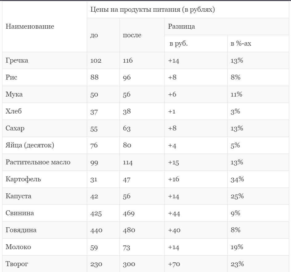 С 01 марта 2022 г. рост цен в России составляет: При этом инфляция еженедельно повышается на 2%, по прогнозам среднегодовая будет в пределах 12,5 – 17%. В 2022 г. случился еще один общемировой коллапс – рынок товаров и услуг, цепочка взаимоотношений Запада и России практически полностью разрушены. С начала военной спецоперации на Украине, образовался настоящий вакуум очередных экономических проблем. Как известно Россия стала мировым лидером по количеству санкций. Сегодня это повлияло на рост цен, что в феврале уже дало инфляцию на уровне 11%, в марте этот показатель стал еще больше на 1,5%. Но есть внутренние рычаги ее снижения, в особенности, если дело касается повышения цен на продукты питания. По заявлению ФАС стоимость на продукцию, входящую в базовый набор потребительской корзины, не должна сильно увеличиться. Допустимое значение в пределах 5%. Но эксперты экономики полагают, что довольно сложно сегодня уложиться в такие рамки. С 01 марта средние расценки на товары можно наблюдать