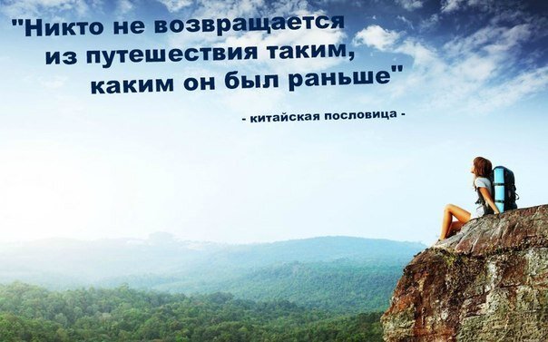 Раньше в моей голове всегда крутился один и тот же вопрос: «Как поменять свою жизнь? Как добавить в жизнь разнообразия?» На просторах интернета были одни и те же рекомендации: заняться спортом, найти новых друзей, заняться новым хобби и все в таком роде. Не спорю, это все помогало, но не надолго. И в голове снова начинал крутиться этот же вопрос «Как поменять свою жизнь?». Листая ленту вконтакте наткнулась на такую картинку После этих слов и началась моя любовь к путешествиям. Теперь, если в моей голове и возникает этот вопрос про новую жизнь и изменения, я знаю на него ответ. НАЧНИ ПУТЕШЕСТВОВАТЬ! После путешествия сложно остаться таким же, как прежде. Путешествия расширяют наш кругозор, меняют нашу жизнь в лучшую сторону. И, если вы уже собрались или только планируете поехать в путешествие, вот, какие изменения вас ждут: 1. Расширяете свое мировоззрение В процессе общения с новыми людьми и местами вы знакомитесь с новыми взглядами на жизнь, ценностями и традици