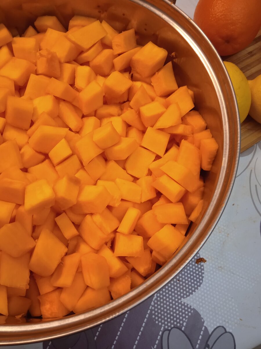 Сказочное тыквенное варенье. Варенье из тыквы обычно я варю зимой. Те тыквы которые уже начинают портиться я использую в кулинарии и варю варенье. Процедура подготовки тыквы обыкновенная: мою, режу на куски, чищу и нарезаю на удобные кусочки. Складываю в кастрюлю, засыпаю сахаром, туда же кладу промытую и порезанную курагу, тщательно промытые и ошпаренные кипятком нарезанные на кусочки лимоны и апельсины с корочкой. Все перемешиваю деревянной веселкой, накрываю крышкой и оставляю на ночь. Утром ставлю варить. Довожу до кипения и варю минут 10-15, регулярно перемешивая. Выключаю, даю отдохнуть часа 4-5. Затем снова кипячу минут 10-15, одновременно пробую на сладость. Если необходимо то добавляю сахар. Надо помнить о том, что когда варенье остынет оно будет слаще чем в горячем виде. Затем засыпаю туда бруснику (1/2кг), перемешиваю и оставляю напитаться на ночь. Утром снова кипячу минут 10-20 и раскладываю в горячем виде в заранее подготовленные банки (промытые и прожаренные). Закр