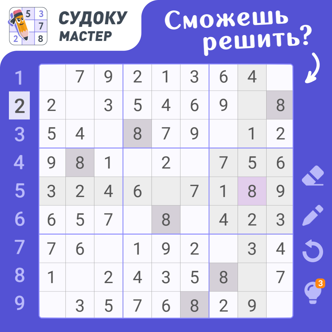 Добрый день, предлагаем испытать себя в сегодняшней задаче Судоку! Если уже знаете ответ, вводите в игровом окне! После этой задачи можете продолжить и решить еще много задач! Успехов!