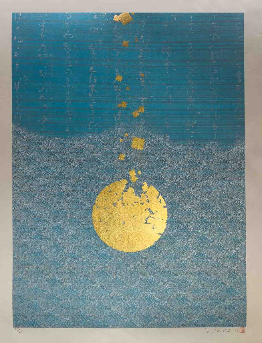 Ширина: 40 см. Ёсимацу Дзюнъитиро (род. 1953) - выдающихся продолжатель традиций сосаку-ханга («творческая гравюра»), когда произведение создаётся художником полностью самостоятельно, начиная от эскиза и кончая печатью. Это позволяет поддерживать высокое качество печати, следить за сохранением общего художественного замысла и дополнять изображение от руки тиснением или нанесением фольги серебра или золота. Работы Ёсимацу представлены на крупнейших аукционах Японии и на данный момент активно приобретаются как японскими, так и западными коллекционерами. В своём творчестве Ёсимацу Дзюнъитиро смело сочетает абстрактные композиции с мотивами классического японского искусства: каллиграфией, изображением театральных масок, национальными орнаментами или растительными мотивами. Целая серия его работ посвящена традиционному театральному жанру ногаку и включает каллиграфические тексты пьес. Авторские названия соответствуют названиям пьес театра. Лист «Мацукадзэ» (Ветер в соснах), по
