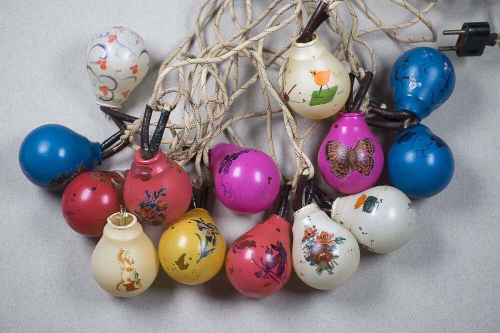 В моей коллекции есть гирлянда с лампами, украшенными росписью и переводными картинками (декалькоманией). В книге "Первые советские елочные украшения", я предположила, что выпускалась она в Москве в 1941 году. Мое предположение подтвердилось! Но, давайте, расскажу по порядку. На одном из форумов в интернете я встречала упоминание об этой гирлянде, и в обсуждении было сказано, что на коробке стоял 1941 год, но фотографии самой коробки не было, поэтому дата выпуска являлась только предположением. И вот, на канале архива кинофотодокументов, я нашла фильм о подготовке к новому 1942 году (Москва, декабрь 1941 года). А там ёлка украшена этой гирляндой! Посмотрите на стоп-кадр То есть, в 1941 году эта гирлянда уже была. Выпускал ее, вероятно, «Московский электроламповый завод», так как такое оформление встречается у игрушек из оплавленных ламповых груш. В прейскуранте 1938 года (Прейскурант отпускных цен на ёлочные украшения производства предприятий всех систем, находящихся в городе Москве