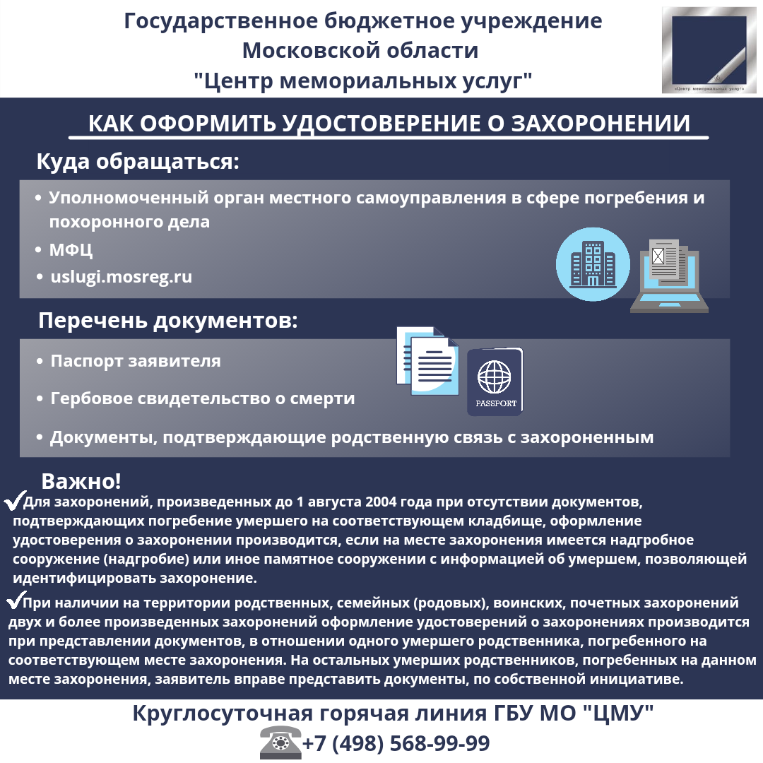 Удостоверение о захоронении важный документ, который подтверждает права человека, взявшего на себя обязанность осуществить погребение умершего на соответствующем месте захоронения. Удостоверение о захоронении понадобится в случае осуществления подзахоронения, при установке/замене надмогильных сооружений и оград, а также для получения других услуг в сфере погребения и похоронного дела. Подать заявление для оформления удостоверения о захоронении можно в уполномоченный орган местного самоуправления в сфере погребения и похоронного дела, через МФЦ, либо направить в электронной форме через портал uslugi.mosreg.ru. Перечень документов, которые необходимы для получения услуги: ▪️паспорт заявителя; ▪️гербовое свидетельство о смерти; ▪️документы, подтверждающие родственную связь с захороненным. Для захоронений, произведенных до 1 августа 2004 года при отсутствии документов, подтверждающих погребение умершего на соответствующем кладбище, оформление удостоверения о захоронении производится,