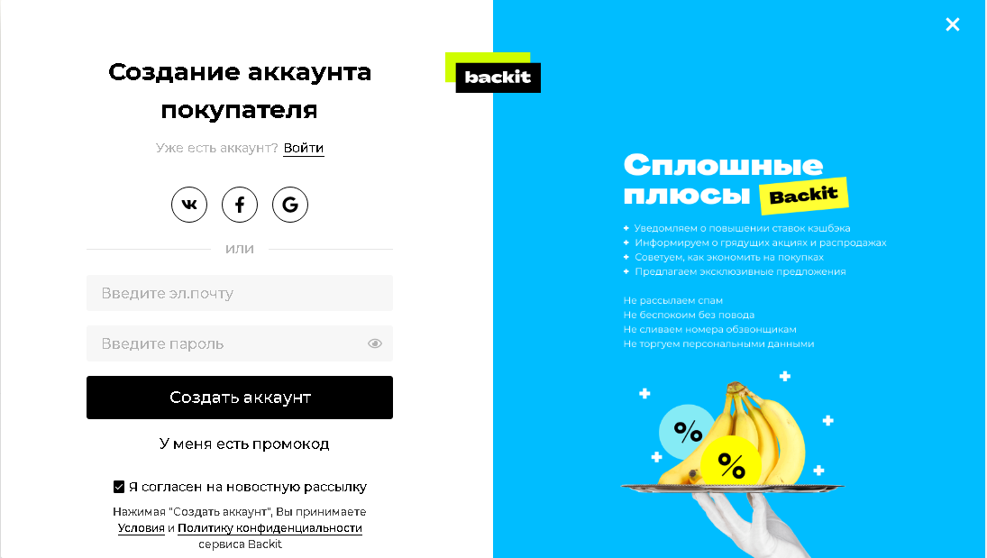 Здравствуйте дорогие читатели. Сегодня мы будем рассматривать кешбэк сервис Backit (Партнёрский материал). Зачем мне нужен этот сервис? Через этот сайт вы сможете покупать многие товары в интернете, и получать за это кешбэк. Так что мы будем получать часть наших потраченных средств назад, то есть экономить. А как говорится - "сэкономил, значит заработал". Тем более, что кешбэк сервис Latyshops, пока перестал функционировать в России. Как зарегистрироваться? Заходим на сайт и нажимаем на кнопку - "Регистрация". После этого, вы переходите на страничку создания аккаунта. Здесь нам надо ввести свою электронную почту и пароль, а потом нажать - "Создать аккаунт". После создания аккаунта вы попадёте на главную страницу сервиса. Так же не забудьте подтвердить свою электронную почту. Ну вот мы и подключились к данному сервису. Советую вам тут осмотреться, посмотреть магазины, которые дают кешбэк и способы вывода денежных средств. Кстати о выводе средств, он производится на такие сервисы, как: