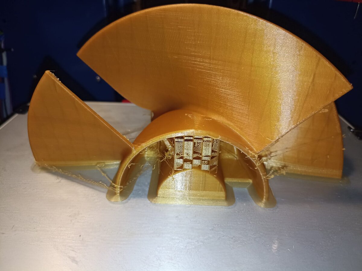 Обо всем по порядку. На фото ниже представлены выжигаемые модели импеллеров и элементов литниково-питающей системы (ЛПС) для получения лопаток ГТД ГПА. Как видно модели импеллеров были выращены на разных принтерах, в том числе на принтере FlashForge Adventurer 3, который имеет весьма малую область печати 150х150х150 мм. Это потребовало деления модели импеллера на 3 части и как итог привело к снижению точности готовой модели, в основном из-за сложности склейки, поскольку последний фрагмент требовалось склеить двумя гранями. Отсюда можно сделать вывод, что лучше поделить модель на 4 части, потратить больше времени и материала на печать, но при этом получить качественную модель, геометрия которой соответствует требуемой.