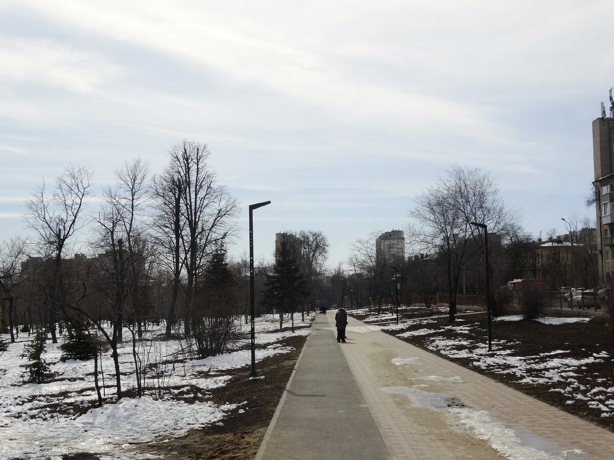 В минувшие выходные я побывал в парке Гагарина. Если кто не знает, это старейший парк Волгограда, он находится в Краснооктябрьском районе города. Когда я тут был в прошлый раз, по парковым аллеям было трудно передвигаться. Минувшая зима выдалась довольно снежной, парковые аллеи были засыпаны снегом, который никто и не думал убирать. Но сейчас уже середина марта, снег активно тает, по парковым аллеям уже можно спокойно ходить, а кто-то даже уже открыл там велосезон. Пару велосипедистов в парке я в тот день встретил. Снег активно тает. Под деревьями образовались большие проталины. Новые павильоны, пустовавшие в прошлом году, постепенно обживаются. В одном из них похоже скоро откроется книжный магазин. По-моему, неплохая идея. Братская могила на центральной аллее парка была недавно отреставрирована. Сейчас работы завершены, ограждение убрано и можно спокойно подойти поближе. Возле братской могилы полно голубей. Они тут есть всегда. В любое время года. Не помню такого, чтобы придя в парк,