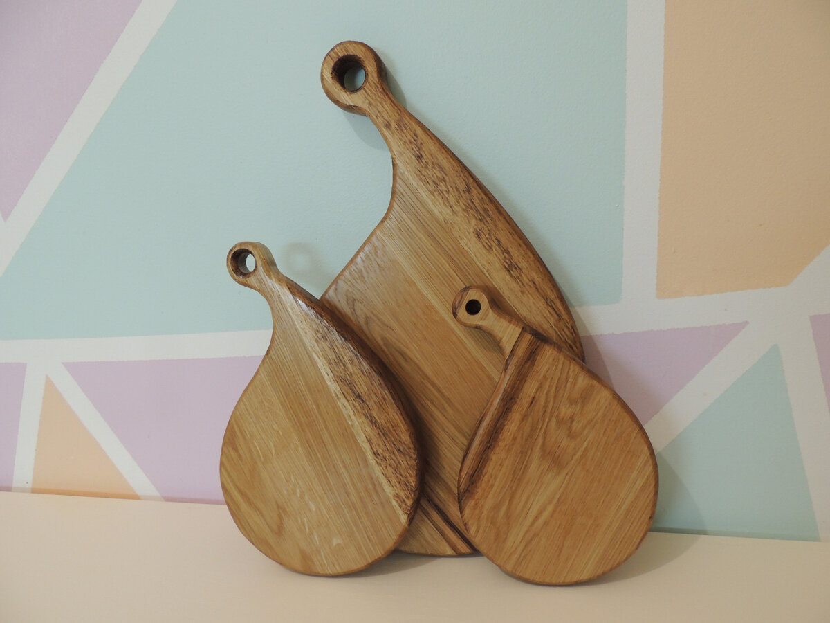 Всем привет! Наткнулся недавно на просторах интернета на один интересный столярный канал и уж очень мне доски у них понравились. К слову сказать у нас дома есть разделочные доски, но они куплены в магазине и нет в них искорки - самые обычные, не пластиковые разве что. Решил сделать себе с супругой в подарок примерно такие же, какие увидел. Чтобы была возможность потом повторить, нужно сделать шаблон. Изготовление шаблона начал с эскиза: сначала рисую нужную форму.. переношу ее на фанеру и лобзиком выпиливаю. Такие ровные края у пропила получились благодаря пилкам по дереву Т101AOF с прямым зубом. Очень они мне понравились при работе с фанерой! Края довожу до нужных форм шлифовкой . Из дубовых ламелей клею щит, переношу контур досок туда и все так же лобзиком выпиливаю чуть с запасом. Запас нужен для того, чтобы потом обгонной фрезой пройтись и выровнять все с шаблоном. Из щита получилась одна большая, три средних и одна маленькая доска. Всего три размера. Дальше подгон по шаблону, шл