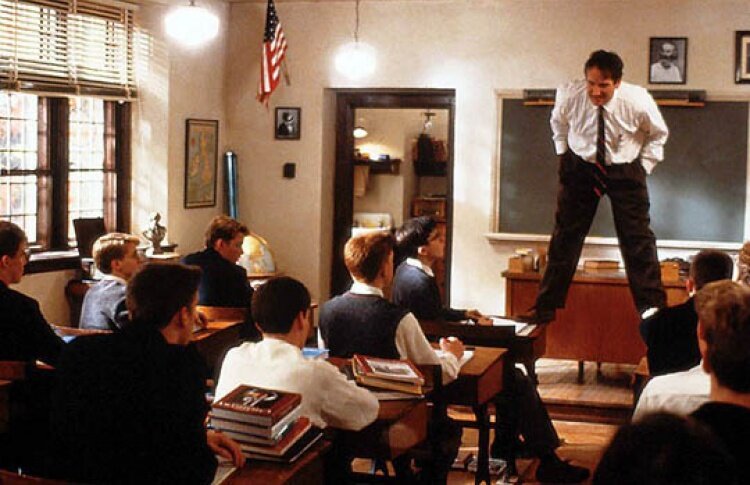 «Общество мертвых поэтов» - фильм режиссёра Питера Уира, на первый взгляд рассказывает о подростковой жизни юношей учащихся в частной религиозной школе, о переживаниях, страданиях и радостных моментах этой чудесной поры. Сюжет фильма заключается в том, как новый учитель – Джон Китинг, сыгранный Робином Уильямсом, придя преподавать в школу, меняет парадигму образовательной системы этого места. На протяжении многих лет школа специализировалась на создание «идеальны» ячеек общества, для которых важна их карьера и консервативность. Китинг сам был учеником этой школы, и так и не смог приспособиться к такому стилю жизни как в школе, так, на мой взгляд, и во взрослой жизни. Он не видел в ценностях, пропагандируемых школой, правильность. Для учителя такие вещи как: карьера, совершенность, консерватизм являются куда менее важными по сравнению с чувственность, романтизмом, любовью и личностной свободой. Это хорошо показано во фрагменте, где на уроке Китинга (одном из немногих, проводимых по учеб