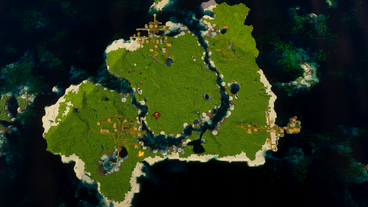 Привет, друг. Вот бывало, что спавнишься в мире, а ничего рядом нет, хотя хотелось бы пару деревень или портал. Эта проблема решается сидом, который представлен ниже. Огромный остров, на котором находится целых 3 деревни, а также разрушенный портал и они все находятся очень близко! Ты спавнишься по середине этого острова, поэтому никуда бежать не придётся.