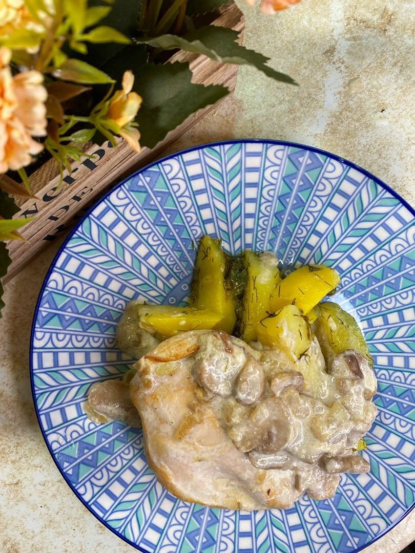 Ингредиенты: Куриное филе, Шампиньоны, Сливки 10 %, Лук, Мука, Соль Способ приготовления: Куриное филе нарезать на слайсы. Лук нарезать мелко. Куриное филе обжарить с двух сторон до золотистой корочки. Куриное филе отложить в сторону, на сковороде обжарить лук и шампиньоны. Когда вся вода выпарится и шампиньоны немного поджарятся, добавьте две столовые ложки муки. Перемешать и затем добавить сливки. Немного потушить. Выложить грибы куриное филе и потушить ещё примерно 5 минут или даже 10, на небольшом огне чтобы не пригорело.