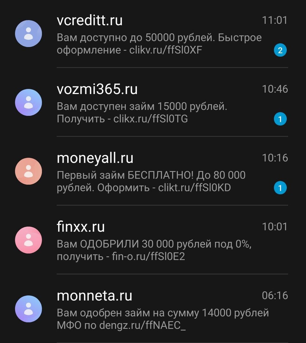 В последнее время всё чаще я и моё окружение стали сталкиваться с подобного рода сообщениями, которые приходят с частотой в 5-6 раз в день, явно навязывая нам какую-то услугу: Безусловно, в первые секунды после увиденного, наш мозг не в состоянии воспринять информацию должным образом, лишь позже можно разобраться что к чему. Но от фразы: "Вам одобрен кредит" волосы могут встать дыбом. Что и произошло со мной. Через минут 10 судорожного поиска какой-либо информации, я решил вспомнить законодательство нашей страны и понял, что в этой истории что-то не так. Дело в том, что любого рода кредит можно оформить только на совершеннолетних граждан РФ, коим я не являюсь. Следовательно, данные рассылки являются лишь очередным спамом. Конечно, если Вы не оставляли заявки в МФО на кредит. В настоящее время мошенники всех планов активизировались, поэтому необходимо быть крайне бдительным и фильтровать информацию максимально чётко. На подобного рода спам стоит, конечно, забить. И если впредь сообщен