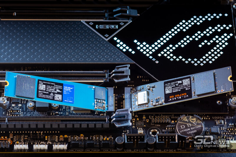 Не нужно удивляться, что мы поставили рядом два SSD, казалось бы, принципиально разных классов. Несмотря на то, что один из них относится к геймерской серии Black, а второй – к массовой Blue, в действительности они мало отличаются друг от друга с точки зрения архитектуры и возможностей. И тот и другой SSD – безбуферные NVMe-накопители на довольно слабых по современным меркам четырёхканальных платформах. Разница лишь в том, что WD Black SN750 SE построен на базе контроллера независимого разработчика Phison и поддерживает интерфейс PCIe 4.0 x4. А WD Blue SN570 – это вертикально интегрированное решение, рождённое внутренней командой инженеров SanDisk, которое поддержки PCIe 4.0 x4 не имеет. Но при этом формальные характеристики этих накопителей довольно близки, причём однозначного ответа на вопрос, какой из этих SSD лучше, спецификации не дают.