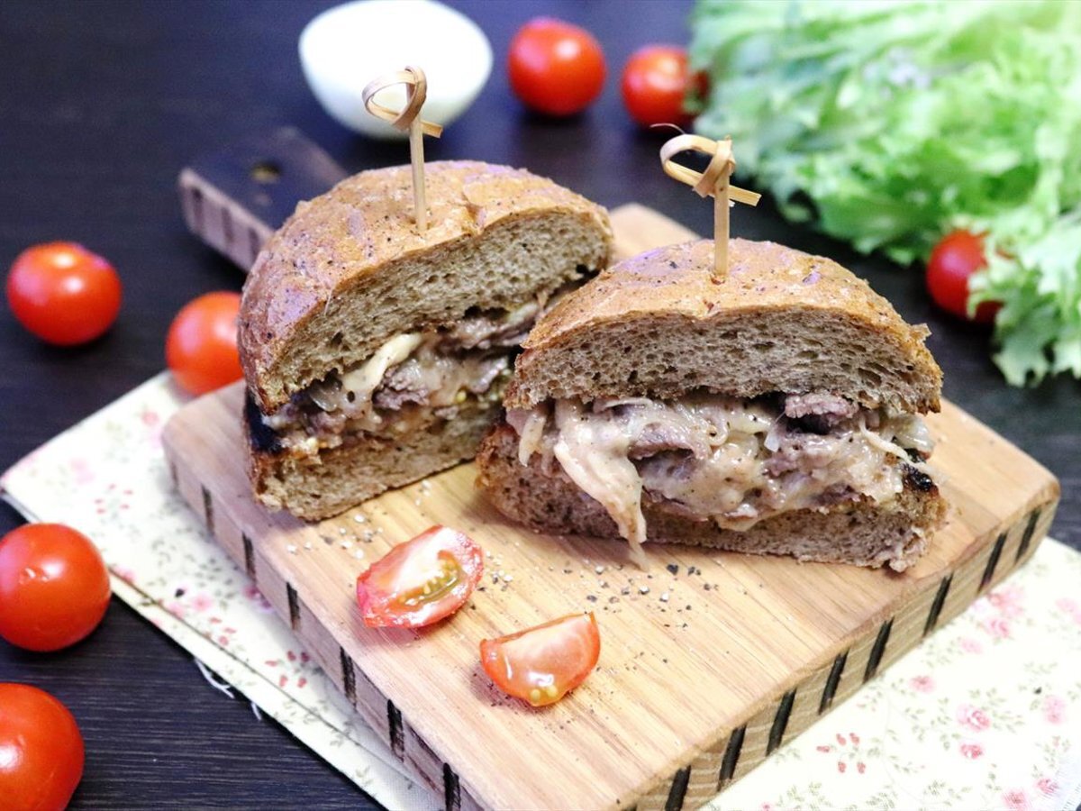 Настоящая мужская еда! Сочная говядина с расплавленным сыром в теплой поджаренной булочке. К такому сэндвичу можно подать овощное рагу или салат. Ккал: 292.62, время приготовления: 40 мин., порций: 2 #Салаты и закуски #Американская #Закуска #На обед #На ужин Ингредиенты Приготовление: 1. Подготовить ингредиенты для сэндвича "Чизстейка". Говядина нужна хорошего качества, у меня мраморная говядина.Сыр в идеале Чеддер, но сгодится любой легкоплавкий сыр. Количество ингредиентов условно, зависит от того, сколько сендвичей вы захотите приготовить. 2. Лук нарезать кубиком. 3. Говядину нарезать тонкими слайсами. Для удобства нарезки советую мясо подморозить в морозилке. 4. Лук обжарить на сливочном масле до мягкости и лёгкой золотистости. 5. Положить к луку кусочки говядины. 6. Жарить мясо, постоянно помешивая до готовности. Мясо должно быть сочным и мягким. Хорошее мясо будет готово минут через 7-10. Посолить и поперчить по вкусу. Но не забывайте, что будет добавляться сыр, который може