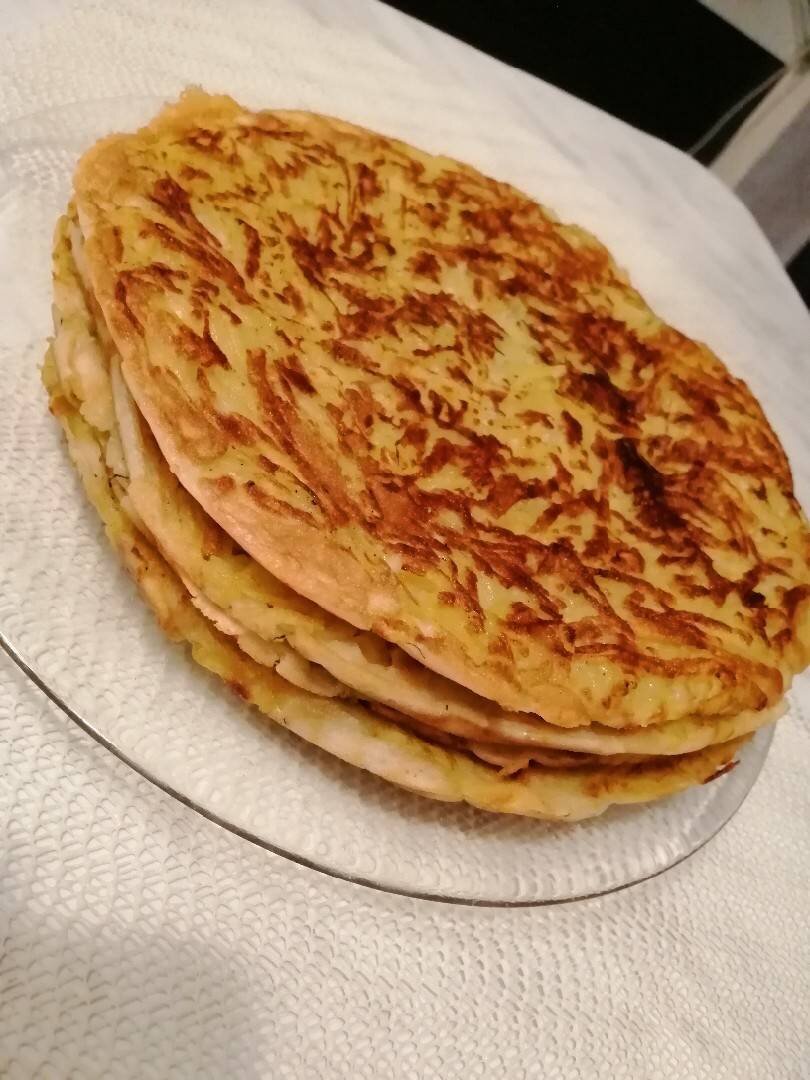 Очень вкусно и просто готовить #обед #легко Ингредиенты: кефира, муки, яйца, соды, соли, растительного масла, картофелины, зелень укропа, соль и черный молотый перец, растительное масло для жарки Способ приготовления: Из этого количества у меня получилось 3 лепешки. Кефир смешать с содой, он начнет пениться. Яйца слегка взбить с солью венчиком. Влить кефир с содой, добавить муку, хорошо перемешать. Добавить 1 ст. л растительного масла и укроп, мелко нарезанный. Перемешать тесто венчиком. Картофель натереть на крупной терке. Посолить и поперчить, перемешать. Удобнее натирать картофель по 1 шт, перед жаркой каждой лепешки. На сковороду налить немного масла, выложить картофель тонким слоем, пожарить 2 минуты, залить тестом, у меня примерно 1 поворежка, жарить пока тесто не схватиться, затем аккуратно перевернуть на другую сторону и жарить еще 2-3 минуты. Выложить на плоское блюдо. Так же проделать с осташимся картофелем и тестом. Подавать со сметаной или с вашим любимым соусом. 💕