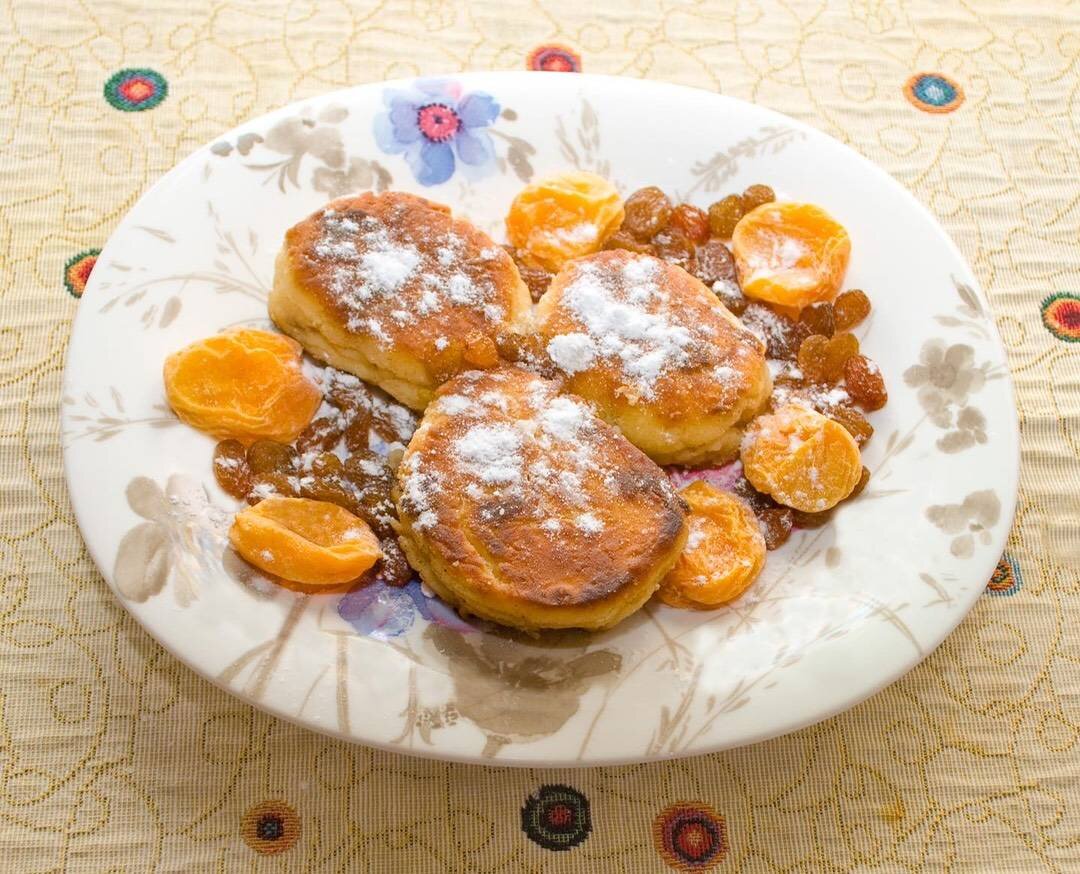 Ингредиенты: Рикотта, Мука, Яйцо, Курага, Изюм, Сушеные яблоки, Сушеная груша, Сахар, Ванильный сахар, Соль, Подсолнечное и сливочное масло (для жарки), Сахарная пудра, Сметана (по желанию) Способ приготовления: Приготовление: Выкладываем в большую плошку рикотту, добавляем яйцо, муку (муки нужно столько чтобы консистенция позволила слепить сырники руками), далее добавляем нарезанные небольшими кусочками сухофрукты (если курага жестка, то её лучше заранее замочить в воде), сахар, ванильный сахар добавляем исключительно по своему вкусу и маленькую щепотку соли для усиления вкуса, тщательно перемешиваем ложкой, далее на доску или стол насыпаем муку и лепим сырники. Разогреваем сковородку с растительным маслом и добавляем маленький кусочек сливочного и прижариваем до образования корочки с двух сторон на сильном огне и потом до готовности на слабом, выкладываем на тарелку и украшаем курагой и изюмом, сахарной пудрой, подавать можно со сметаной. Приятного всем аппетита!