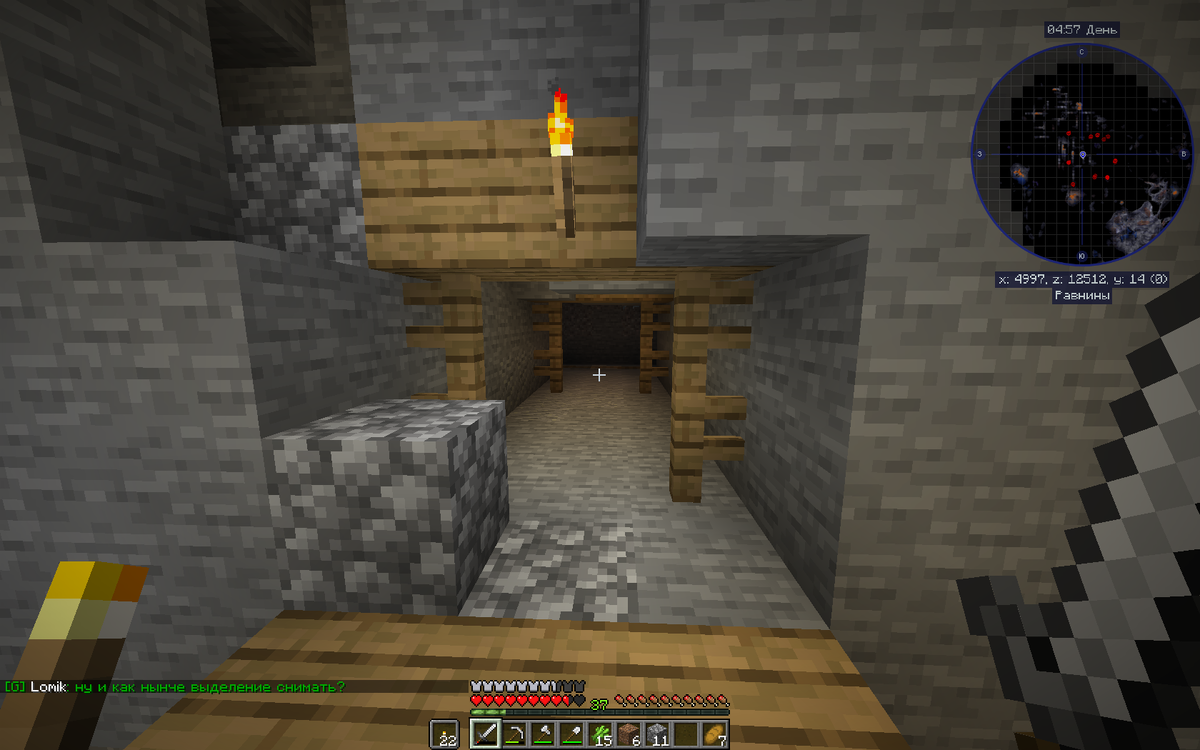 На второй день пребывания в этом мире, спустившись в одну из близрасположенных пещер, мне повезло наткнуться на заброшенные шахты. Но, как оказалось, "повезло" - это слишком громко сказано. За час, что я потратил на их обследование, попалась только одна вагонетка с сундуком. Да и в том была одна ерунда... И даже, не смотря на то что шахты расположены примерно на нулевом уровне, алмазная руда в стене попалась только один раз. Немного исправило положение обнаружение спаунера пауков: Вернувшись домой и освободив инвентарь, отправился проведать вторую деревню, которая расположена юго-западнее первой. Ничего примечательного в ней не нашёл. Ну, разве что у местного кузнеца в сундучке были новенькие "штаны" да ботинки. :))) Возле деревни обнаружился немаленький пляж. Ну как тут пройти мимо? Не удержался и полностью "сточил" железную лопату об песок - в хозяйстве пригодится! :))) Кстати, чтобы не особо портить ландшафт на сервере, я только снял верхний слой. Если понадобится больше песка, э