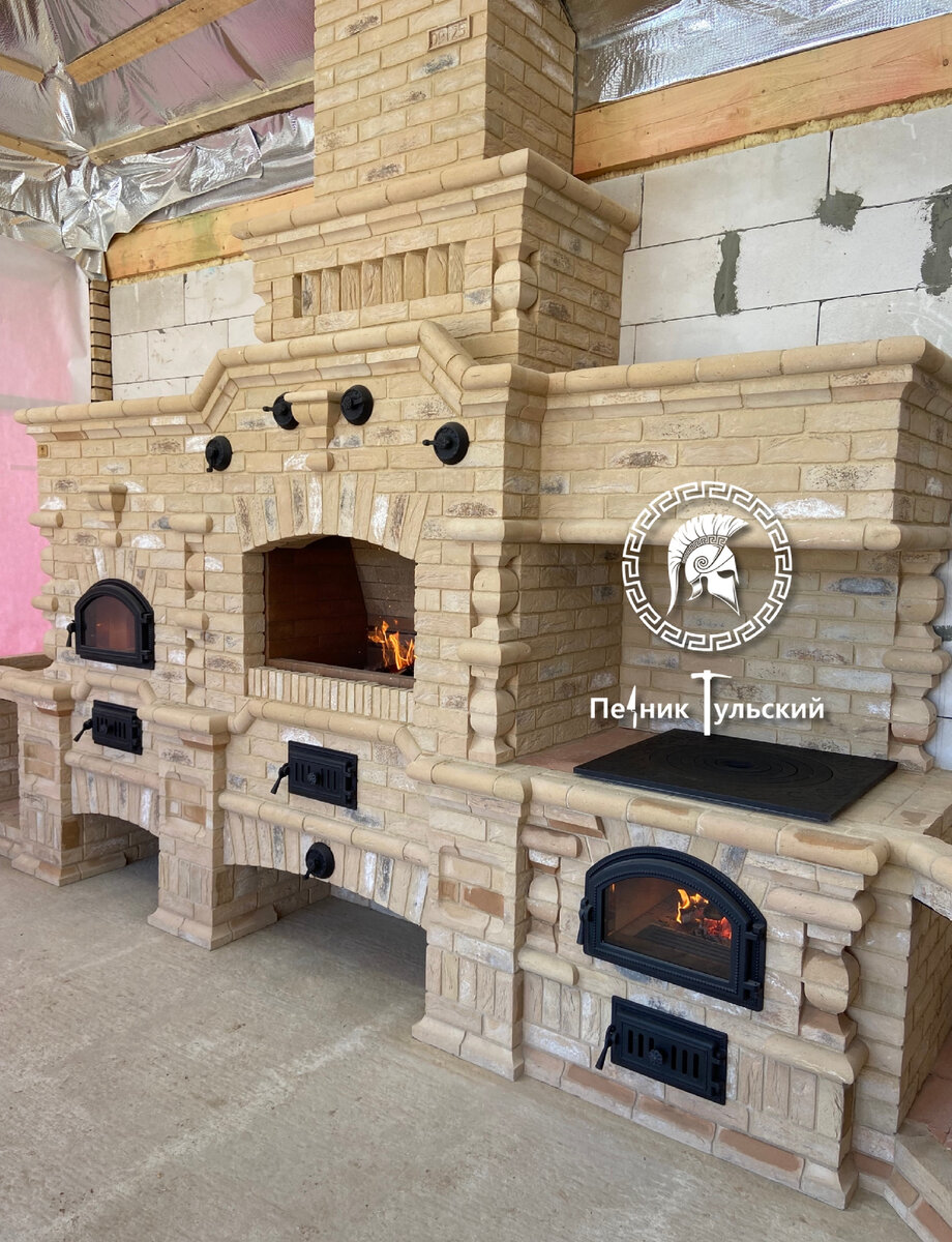 Печной кухонный комплекс барбекю в Нео-Русском стиле ,на три очага (казан,мангал,мини русская печь)