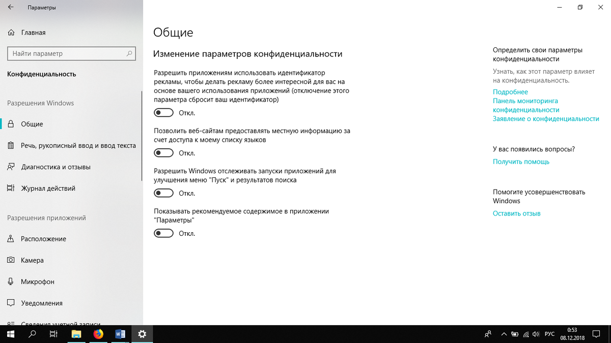 После первого запуска операционной системы в июле 2015 года, посыпался шквал критики в отношении Microsoft, которые были связаны с обработкой персональных данных пользователей. Например, встроенный браузер Microsoft edge собирает информацию с поисков в интернете, Ваше местоположение обрабатывается встроенными сервисами телеметрии, вводимая информация с клавиатуры/рукописным вводом или голосовыми командами считывается и запоминается, постоянное «подслушивание» по микрофону, обработка контактов, текстовых сообщений, чтение жестких дисков и передача ключей шифрования на сервера Microsoft. Все негативно сказалось на первые впечатления об операционной системе. Отключить сбор телеметрии можно при начальной настройки устройства или в настройках конфидециальности: Однако если вы параноик, то с помощью специального ПО можно удалить также недокументированные или неоднозначные способы слежки, спрятанные внутри операционной системы. Destroy Windows 10 Spying — программа c открытым исходным кодо