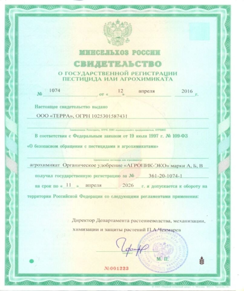 ООО «Терра» создано в г. Окуловка Новгородской области в 1998 году. Основным видом деятельности компании с момента основания является производство органических удобрений. ПРОДУКЦИЯ ООО "ТЕРРА" зарегистрирована и включена в «Государственный каталог пестицидов и агрохимикатов, разрешенных к применению на территории Российской Федерации». В настоящее время ООО «Терра» выпускает органические удобрения под собственной торговой маркой, является единственным производителем в России удобрений «АГРОПИК-ЭКО». С ПЕРВЫХ ДНЕЙ СУЩЕСТВОВАНИЯ компании, мы боремся за качество выпускаемой продукции и удовлетворение потребностей наших клиентов. Мы дорожим каждым нашим потребителем, поэтому высокое качество нашего продукта, является приоритетом для нас. ИНФОРМАЦИЯ О ПРОДУКТЕ СОСТАВ УДОБРЕНИЙ -Торф -Бурый уголь -Природные минеральные составляющие -Гумусообразующие биокомпоненты. ДЛЯ ЧЕГО ПРИМЕНЯЕТСЯ УДОБРЕНИЕ «АГРОПИК-ЭКО» Для поддержания в почве бездефицитного баланса гумуса и качества постоянно э