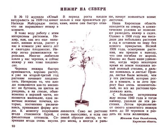 Юннатка Оля Оглоблина в своей интересной статье «Инжир на севере» (см. «Юный натуралист» № 2, 1940 г.) пишет: «Интересно то, что плоды появляются както внезапно: ни бутонов, ни цветов не увидишь, а на стволе, обыкновенно в верхней части, появляются маленькие, едва заметные почечки, которые, постепенно увеличиваясь, принимают форму ягоды». Эти зеленые «почечки», которые, постепенно увеличиваясь, превращаются в зёленую ягоду, и есть бутоны соцветий инжира. Они, правда, совсем не похожи на цветки, а скорее на зелёную грушу. На рисунке вы видите разрез такого соцветия: полая «груша», усаженная внутри множеством мелких цветочков. Отдельный пестичный цветок изображен на рисунке. Инжир - растение двудомное: у одного дерева все соцветия только с женскими цветками, у другого все с мужскими. Во время созревания инжира наружная, мясистая оболочка соцветия разрастается и превращается в мякоть той «винной ягоды», которую мы едим. Интересно отметить, что у Оли плоды получаются без оплодотворени