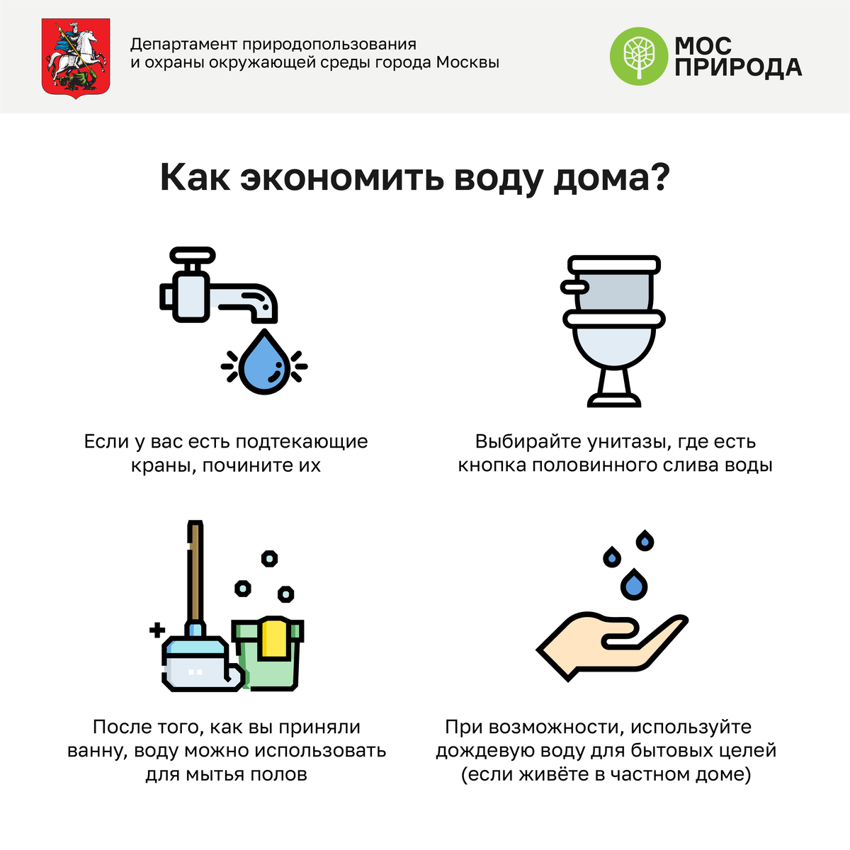 - Рациональное использование воды является одной из важных экопривычек. Специалисты Мосприроды рекомендуют стараться внедрить их в повседневную жизнь. Экопривычки помогают снизить количество отходов, экономят деньги, берегут время, влияют на общество, делают жизнь интересней, помогают саморазвитию и, конечно же, делают зеленое будущее возможным.
