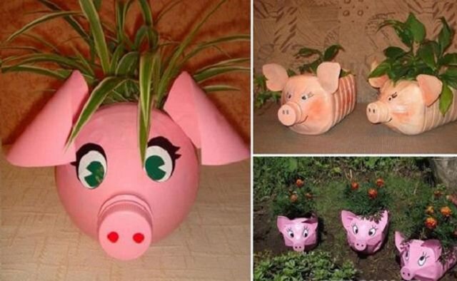 Из бутылок объёмом 5-6 литров можно сделать красивого поросёнка, форма тары как раз напоминает тело хрюшки.