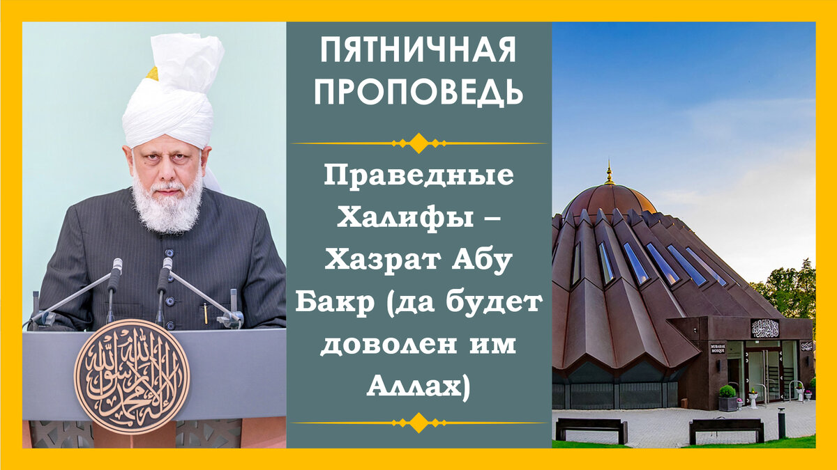 После ташаххуда, тааввуза и суры «Аль-Фатиха», Его Святейшество, Хазрат Мирза Масрур Ахмад, да пребудет с ним могучая помощь Всевышнего Аллаха, сказал, что он продолжит рассказывать о том, как Хазрат Абу Бакр (да будет доволен им Аллах) обращался с теми, кто выступал против закята.