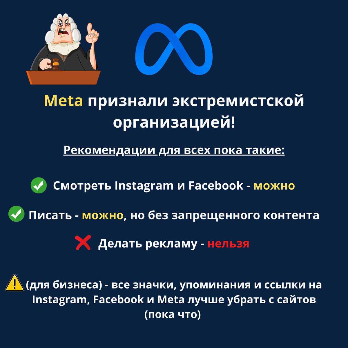 🚫Как известно, вчера Meta (Инстаграм и Фейсбук) признали экстремистской организацией на территории РФ. ☝Дабы обезопасить себя от потенциальной ответственности рекомендуем пока следующее: ❗P.S. Данные ограничения не касаются WhatsApp. Во всяком случае про его блокировку речи не шло. #matuslaw #meta #instagram #facebook #whatsapp