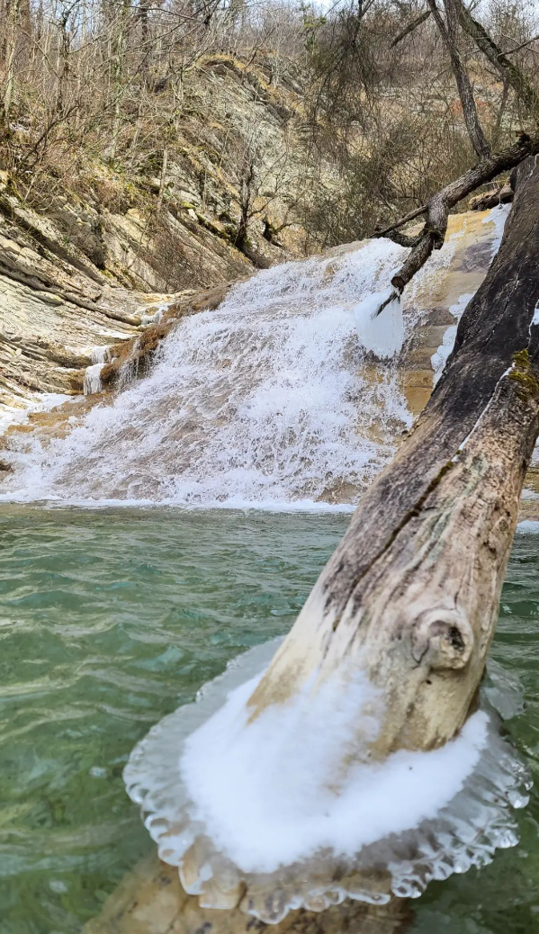 Как видно по фото, ранней весной в этому году здесь вокруг до сих пор ледяное царство (фото сделаны 19 марта). Но если в теплое время года двигаться по руслу реки, то встретится несколько мест, где надо пройти вброд. Без резиновых сапог не обойтись, а если это лето, то не грех и промочить ноги.