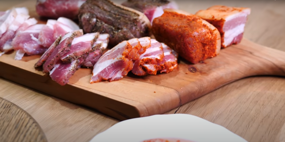Друзья всем огромный привет, я лично просто обожаю сало и знаю много различных рецептов. Сегодня хочу вам показать очень крутой рецепт засолки сала в банке, готовится не сложно, но подождать придётся дней 5 и поверьте это того стоит. Смотрим продукты. Поехали. У меня здесь конечно не совсем сало — это свиная грудинка, обожаю, когда пропорции сало и мясо примерно 50 на 50. Посмотрите какие аппетитные кусочки, но они станут меньше. Здесь будем удалять ребра как раз будет что запечь на вечер в духовке. Далее чеснок, соль, соль и потребуется много на литр воды 8 столовых ложек перец душистый, лавровый лист, перец горошком, две банки. Первым делом занимаемся рассолом так как он у нас еще должен остыть. Кастрюлю ставим на огонь включаем плиту. Вода начинает закипать, отправляем сюда 8 столовых ложек соли, уже проверено именно столько и нужно, далее лавровый лист, перец горошком, душистый перец на глаз примерно. Теперь все хорошо перемешиваем необходимо чтобы у нас соль полностью растворилас
