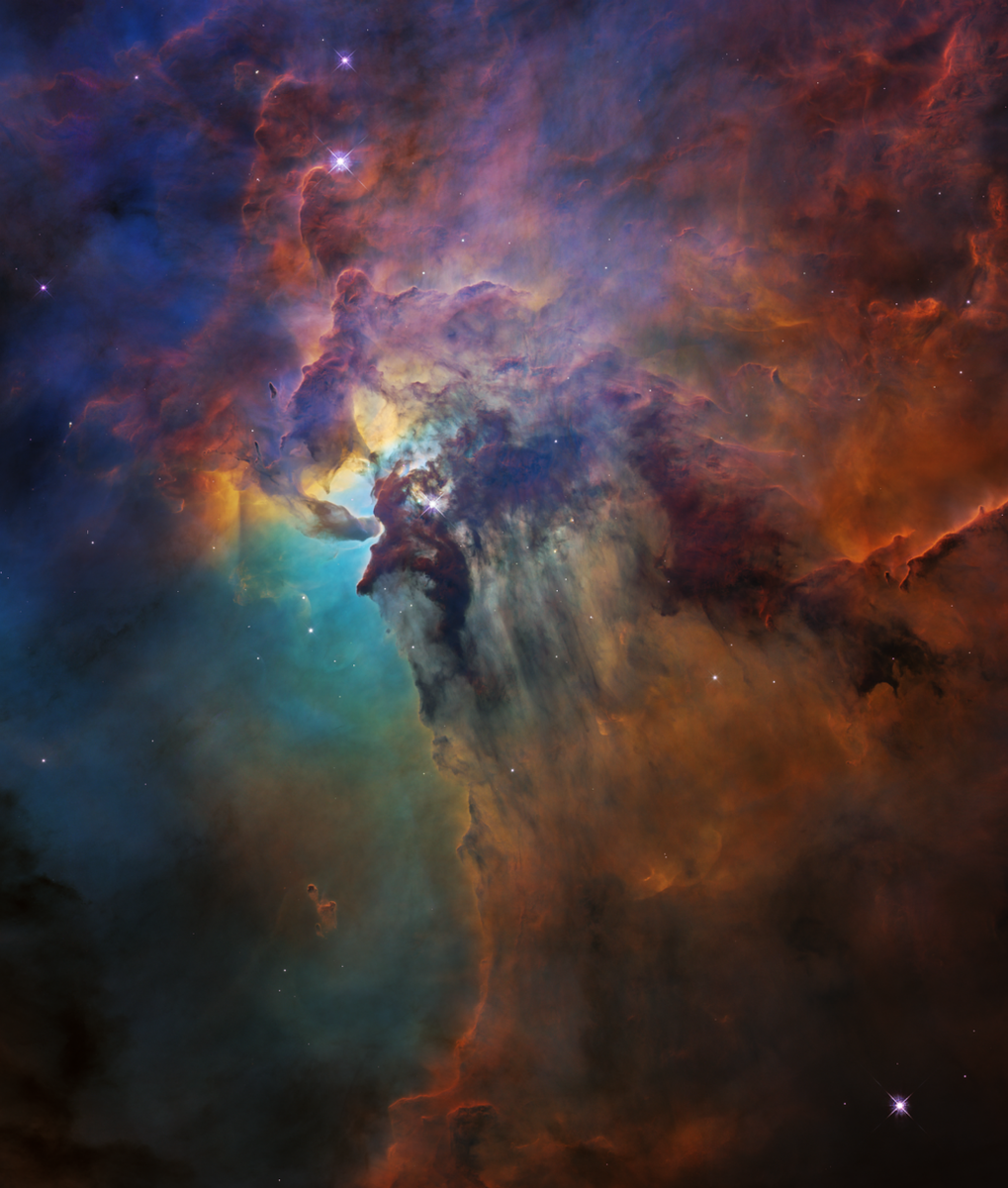 Это красочное изображение, полученное космическим телескопом Хаббла и опубликованное в 2018 году, посвящено 28-й годовщине наблюдения небесной обсерватории на околоземной орбите , давая нам возможность увидеть необыкновенный гобелен вселенной звездных рождений и разрушений. В центре фотографии огромная молодая звезда, в 200 000 раз ярче нашего Солнца, испускает мощное ультрафиолетовое излучение и ураганные звездные ветры, вырезая фантастический ландшафт из хребтов, полостей и гор газа и пыли. Весь этот беспредел происходит в самом сердце туманности Лагуна, огромной звездной колыбели, расположенной на расстоянии 4000 световых лет от нас и видимой в бинокль просто как пятно света с ярким ядром. Гигантская звезда под названием Гершель 36 вырывается из своего природного кокона из материи, высвобождая обжигающее излучение и проливные звездные ветры (потоки субатомных частиц), отбрасывающие пыль в виде завесы. Это действие напоминает солнце, пробивающееся сквозь тучи в конце дневной грозы,