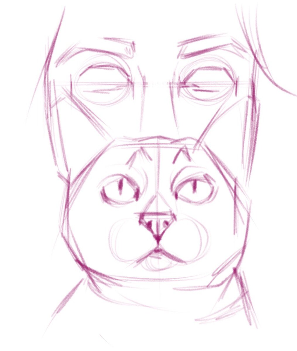 Портрет был нарисован на планшете в программе procreate. Выбираем референс с красивым котом и выразительными глазами девушки, анализируем его и разбиваем на более простые геометрические формы, строим горизонтальные и вертикальные оси. Затем уточняем детали, прорисовываем брови, глаза, мордочку котика на новом слое. Можно приступать к заливке цветом, также на новом слое. Закрашиваем все плоскости. Обратите внимание на белок глаз, не нужно делать его белым (в данном портрете лучше взять серо-голубой оттенок). Постепенно будет добавлять более темные цвета в тенях (в углублении глаз, в волосах девушки), можно делать это с помощью наложения (режим в слоях). У котика мягкой кисточкой рисуем светлую шерсть. Продолжаем прорабатывать шерсть кота, его уши. Добавляем усов, делаем глаза кота более выразительными за счет ярких бликов. Сверху зрачок будет темнее. Нам осталось проработать лицо и волосы девушки. Блики на зрачках сразу оживят взгляд, тонкие пряди волос добавят динамичности. Веснуш
